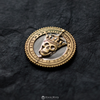 This Antique Gold Coin with Silver can be used as a dealer button, card guard, display piece, or decision maker. The front side features the Roses Skull and Sword and the back features the Roses Seal.